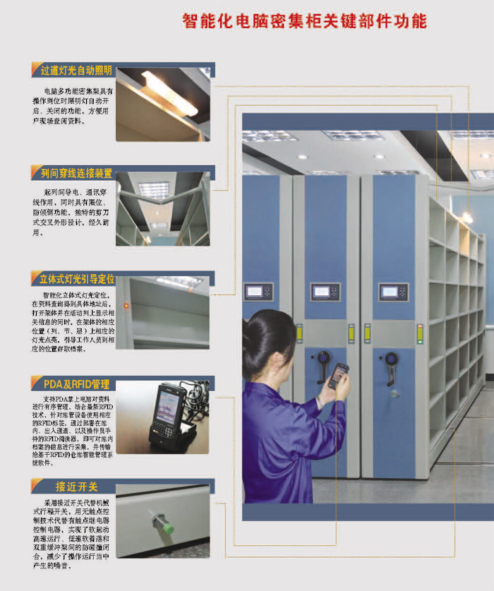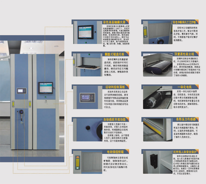 電腦多功能密集架具有操作到位時(shí)照明燈自動(dòng)開啟、關(guān)閉的功能,方便用戶現(xiàn)場查閱資料